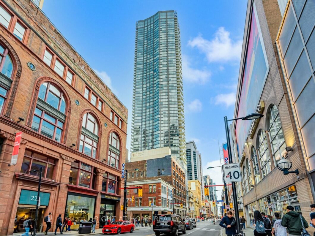 Sun filled 1-bedroom unit in The Massey Tower with 9′ ceilings. Functional layout, large balcony. Kitchen features contemporary European paneled appliances and quartz countertops. Convenient kitchen island with B/I dining table and extra storage. Windows equipped with roller blinds. 2 lockers. Across the street from Eaton Centre and steps to subway and neighborhoods including Financial District and Ryerson (TMU).