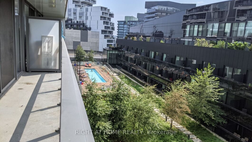 Brightly lit with floor to ceiling windows, 9′ exposed ceilings, laminate flooring throughout, wall to wall closet in bedroom, walk out to balcony from living space or the den. Spacious den enclosed or open with sliding doors! Balcony overlooks the outdoor pool, sundeck and greenery. Steps to parkland and trails, Underpass Park, basketball court, easy access to downtown Toronto with King and Queen St streetcars, highway; walk to Distillery District, St. Lawrence Market, Riverside. A locker Is Included For Use.